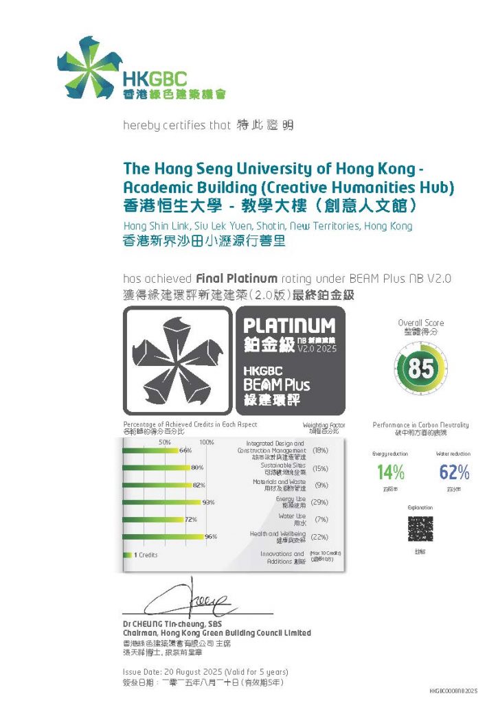 Between the years 2014 and 2016, three Final Platinum ratings of BEAM Plus New Buildings V1.1 were awarded to HSUHK’s S H Ho Academic Building, Lee Shau Kee Complex and Lee Quo Wei Academic Building respectively. In addition, the University received the Final Platinum rating of BEAM Plus New Buildings V1.2 for the HSUHK Jockey Club Residential Colleges and was selected as a “Finalist” for the Green Building Award 2016 under the New Buildings Category (Completed Projects) – Institutional Building in 2016 as well. Furthermore, the University achieved the Final Platinum rating of BEAM Plus New Buildings V2.0 certification for Creative Humanities Hub in 2025, which is a new academic building completed and operated in February 2024.