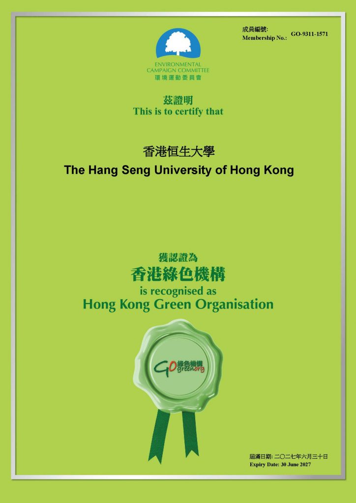 - Hong Kong Green Organisation (香港綠色機構), by the Hong Kong Green Organisation Certification under Environmental Campaign Committee and Environmental Protection Department;