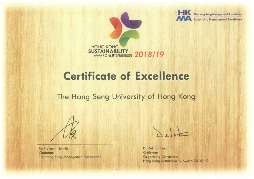 - Hong Kong Sustainability Award 18/19 – Certificate of Excellent (香港可持續發展獎)(Large Organisation Category), by Hong Kong Management Association
